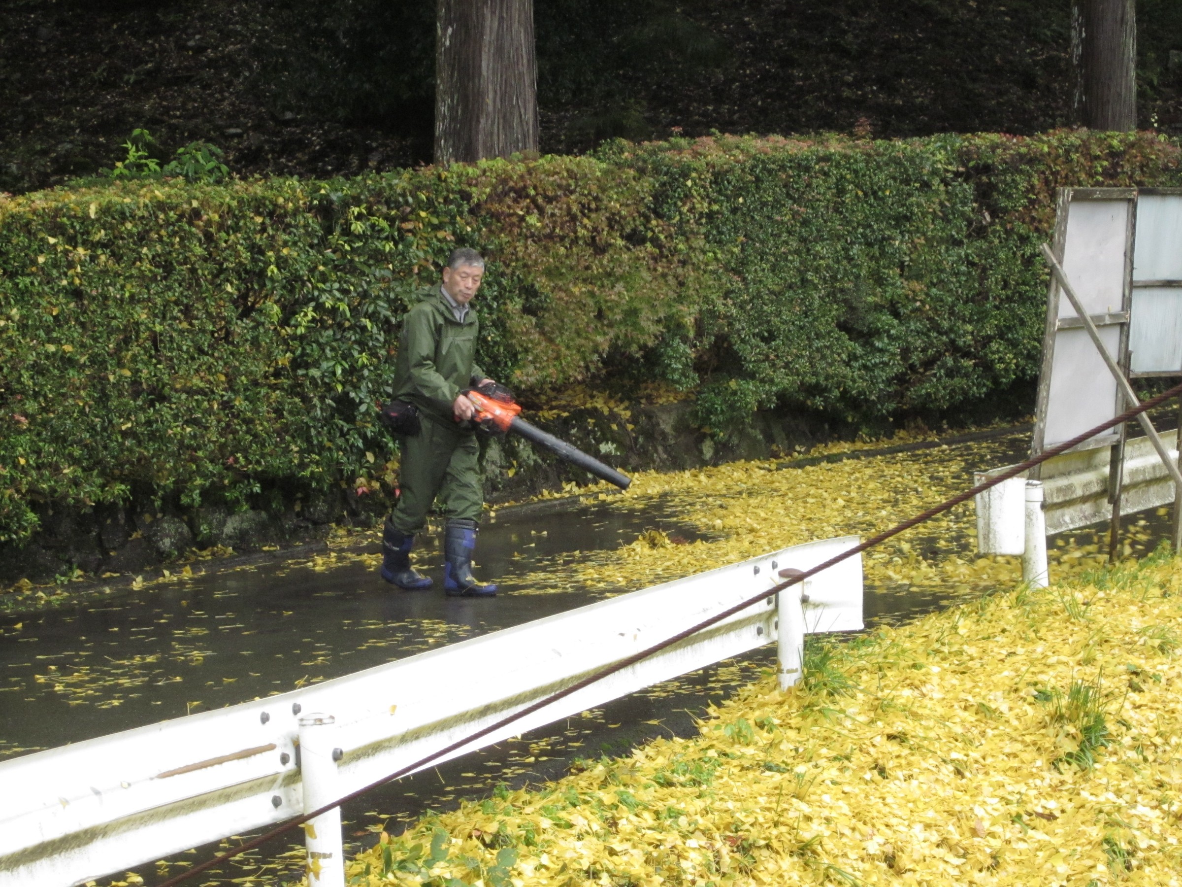 道端で地元の方が、ブロワーでとアスファルトの道路に散っている落ち葉を吹き掃除をされていましたが
