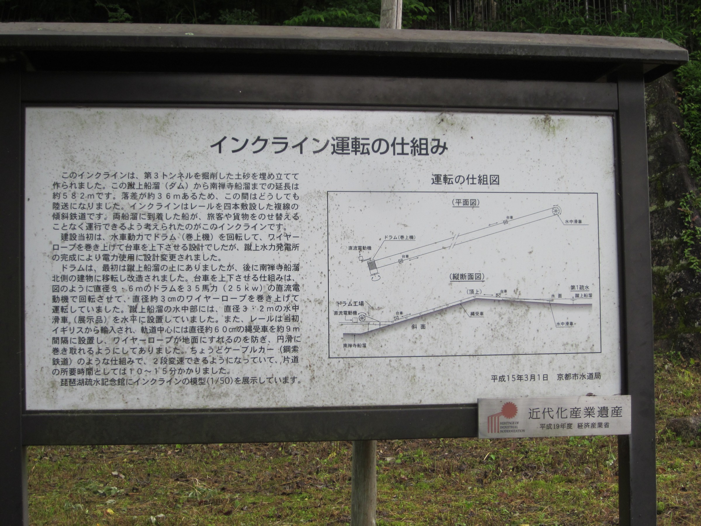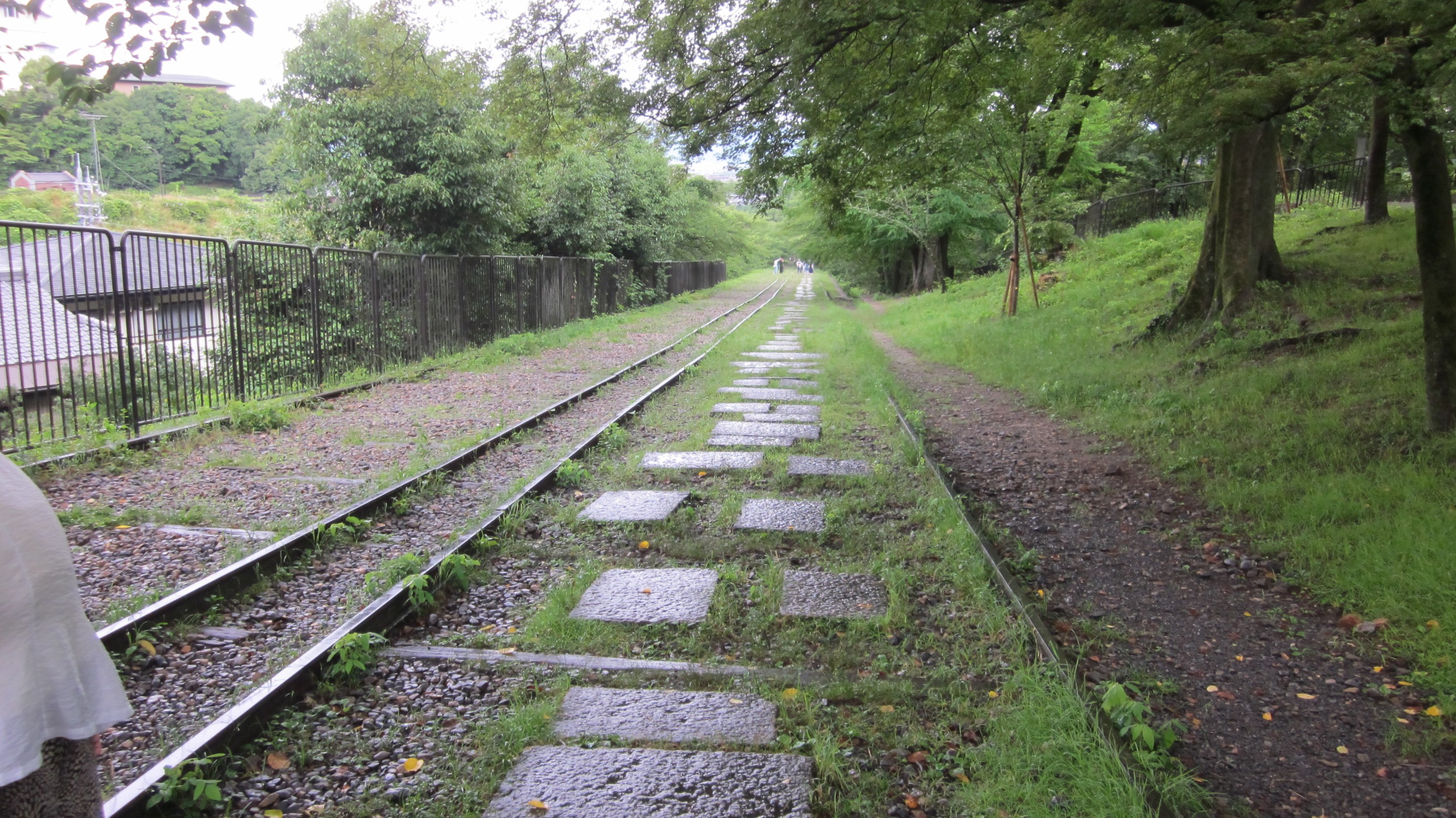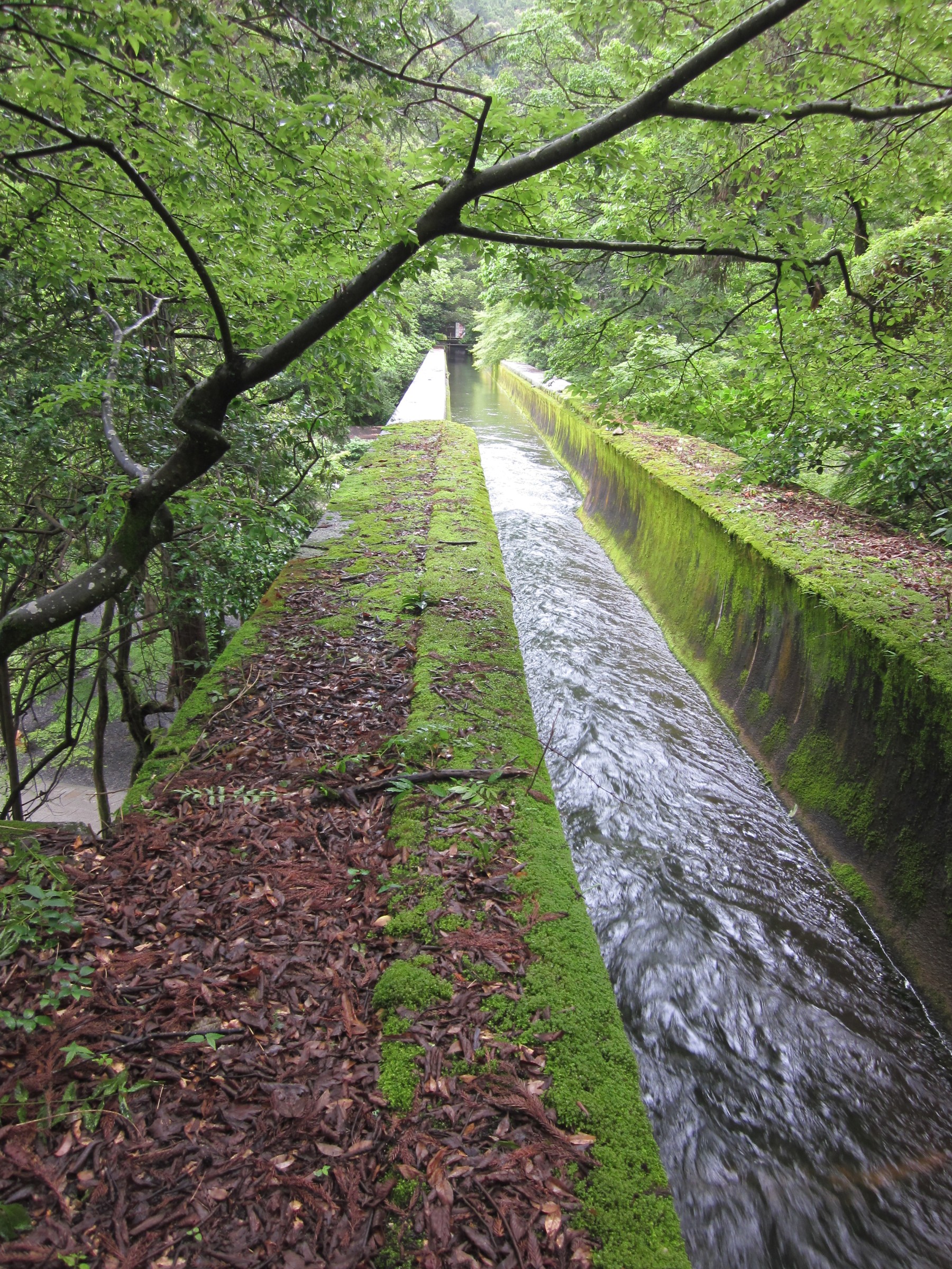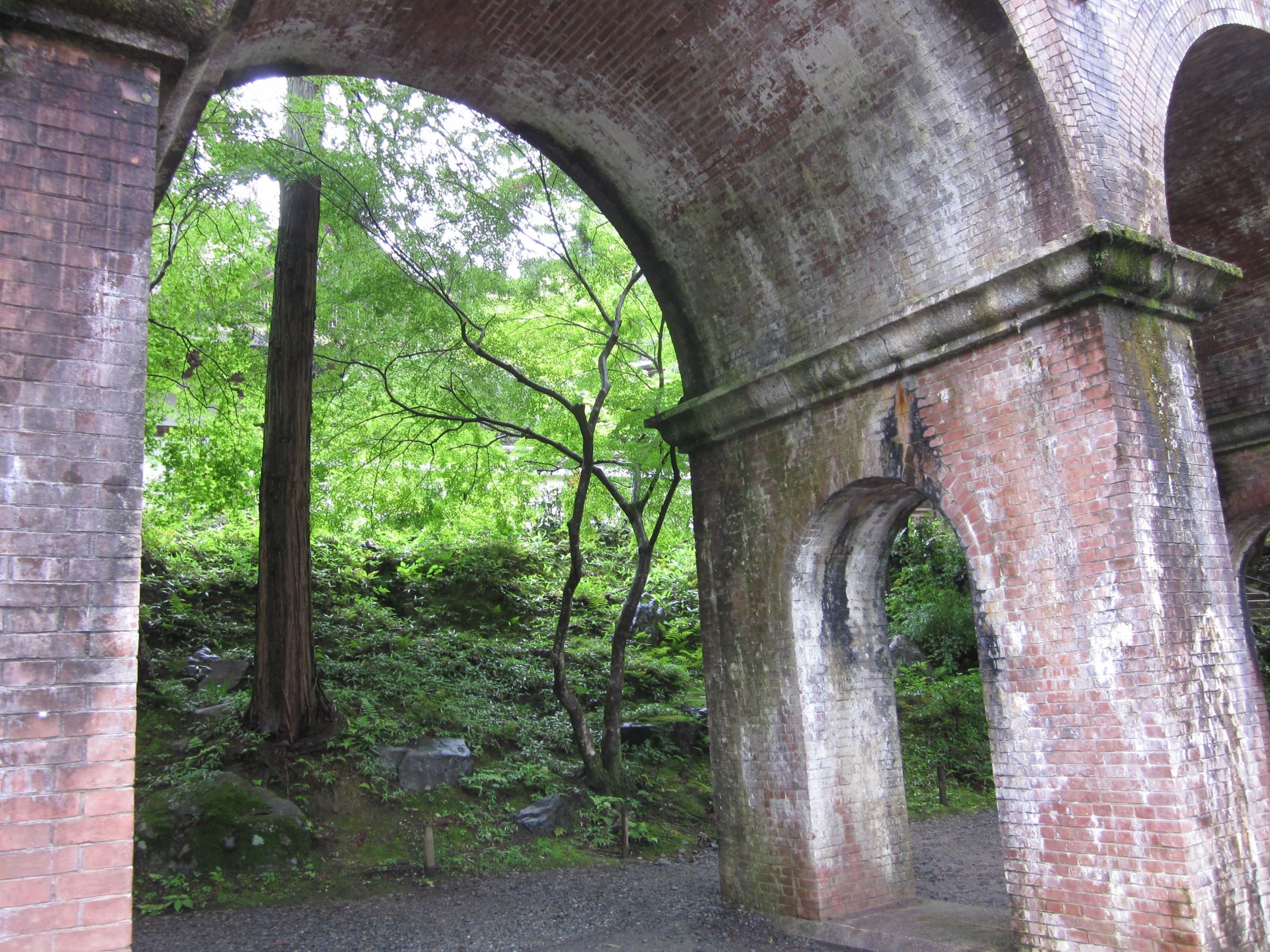水路閣の西側に階段があるので、登っていくと水路閣の上にたどり着きます、琵琶湖の水をトンネルをくり抜いて引いた水路で、東に向かっていますが銀閣寺にたどり着き「哲学の小道」に流れるせせらぎとなり、西に歩くと日本初の発電所とインクラインが見えてきます。このあたりになると、観光客も少なく深緑を満喫できます。