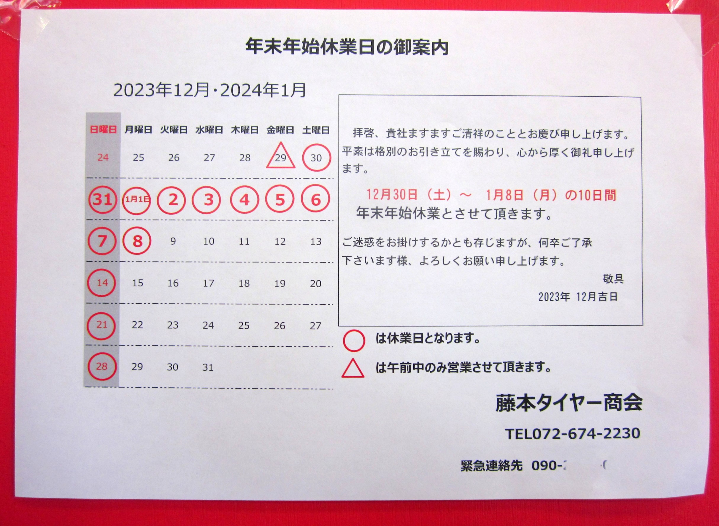おれ達お父さんの店「ミスタータイヤマン高槻」の、年末年始休業日のお知らせです。