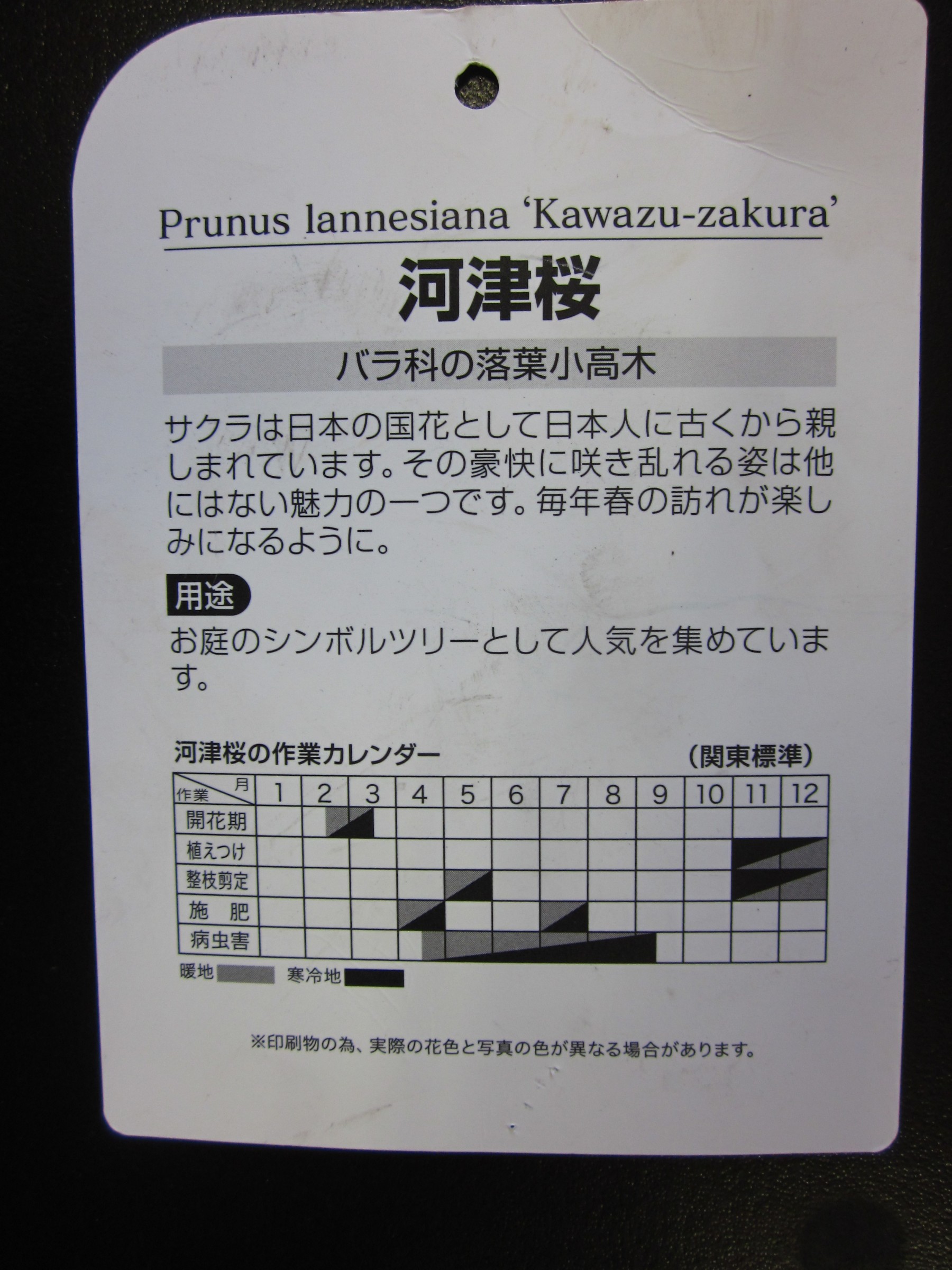 ホームセンターで色々花を眺めているときに、たまたま「河津桜」が目に入ったので迷わず