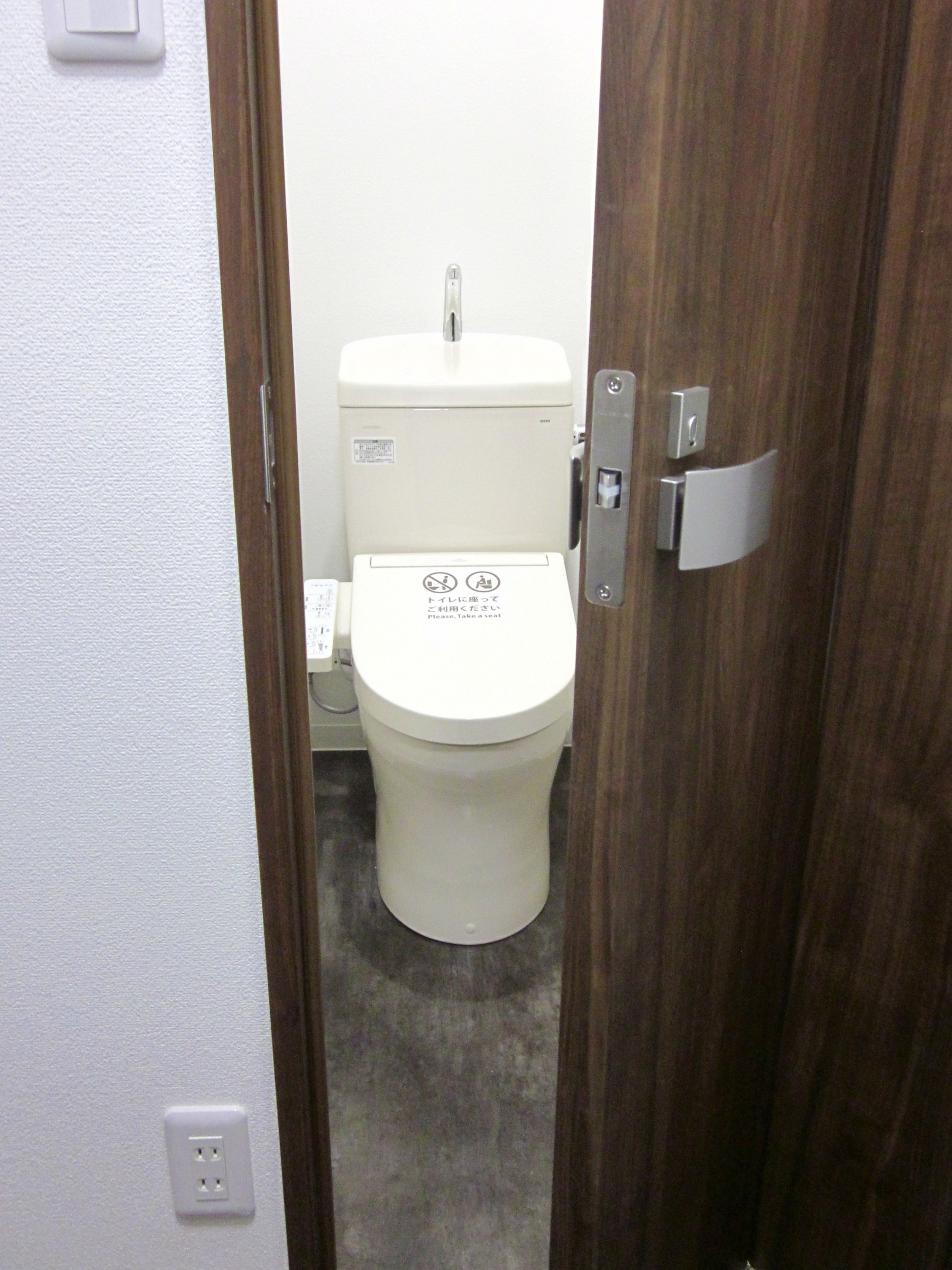 トイレ、お手洗いの入口ドアーは高級感溢れるオシャレなドアーでハンドル式のノブです。