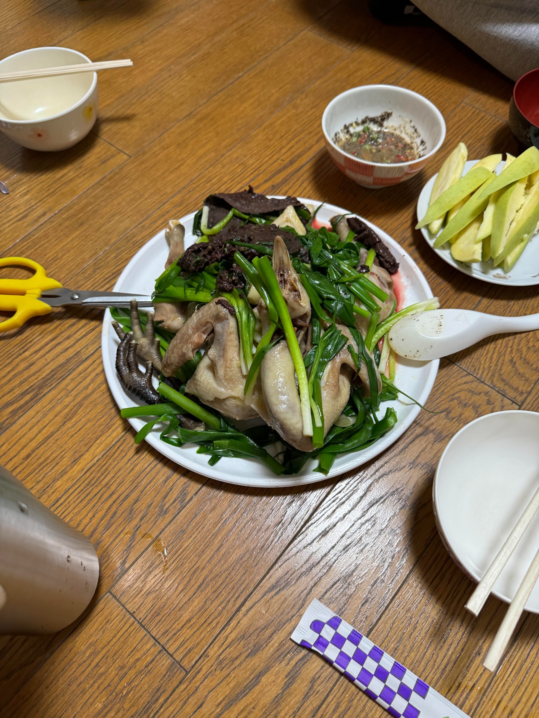 お皿に盛ってある鶏ですが、頭から足まで余すことなく料理されてますね、、美味そうです、