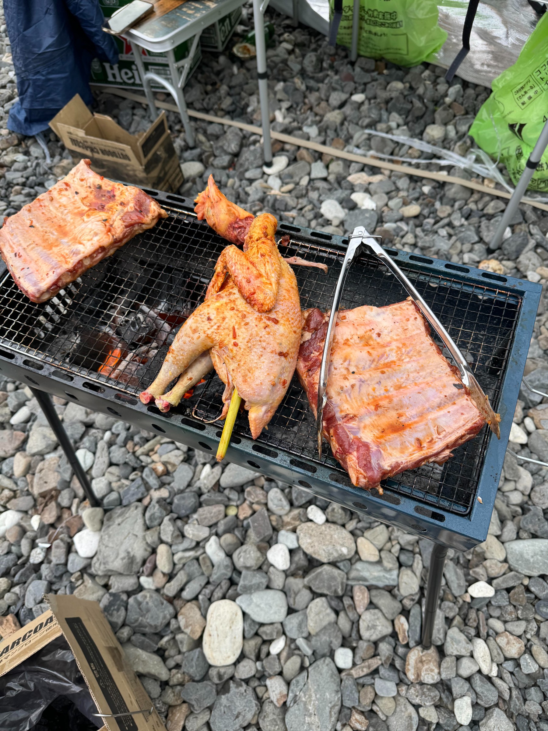 BBQは豚の骨付きカルビと一緒に焼いてますが、2羽では少ないのかもしれないですね、、