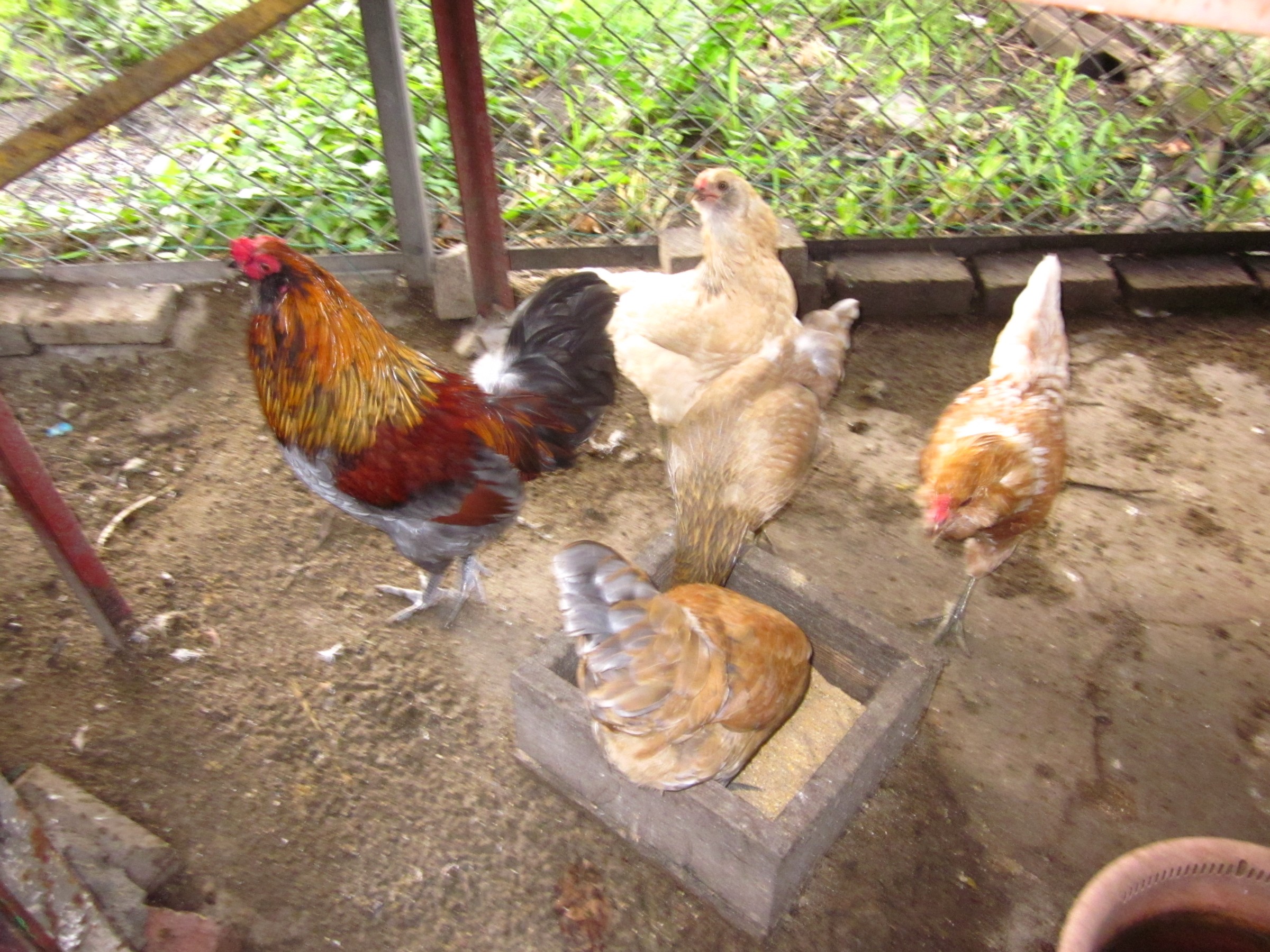 ミスタータイタマン高槻で飼育しているニワトリ オス3羽 メス4羽のうち