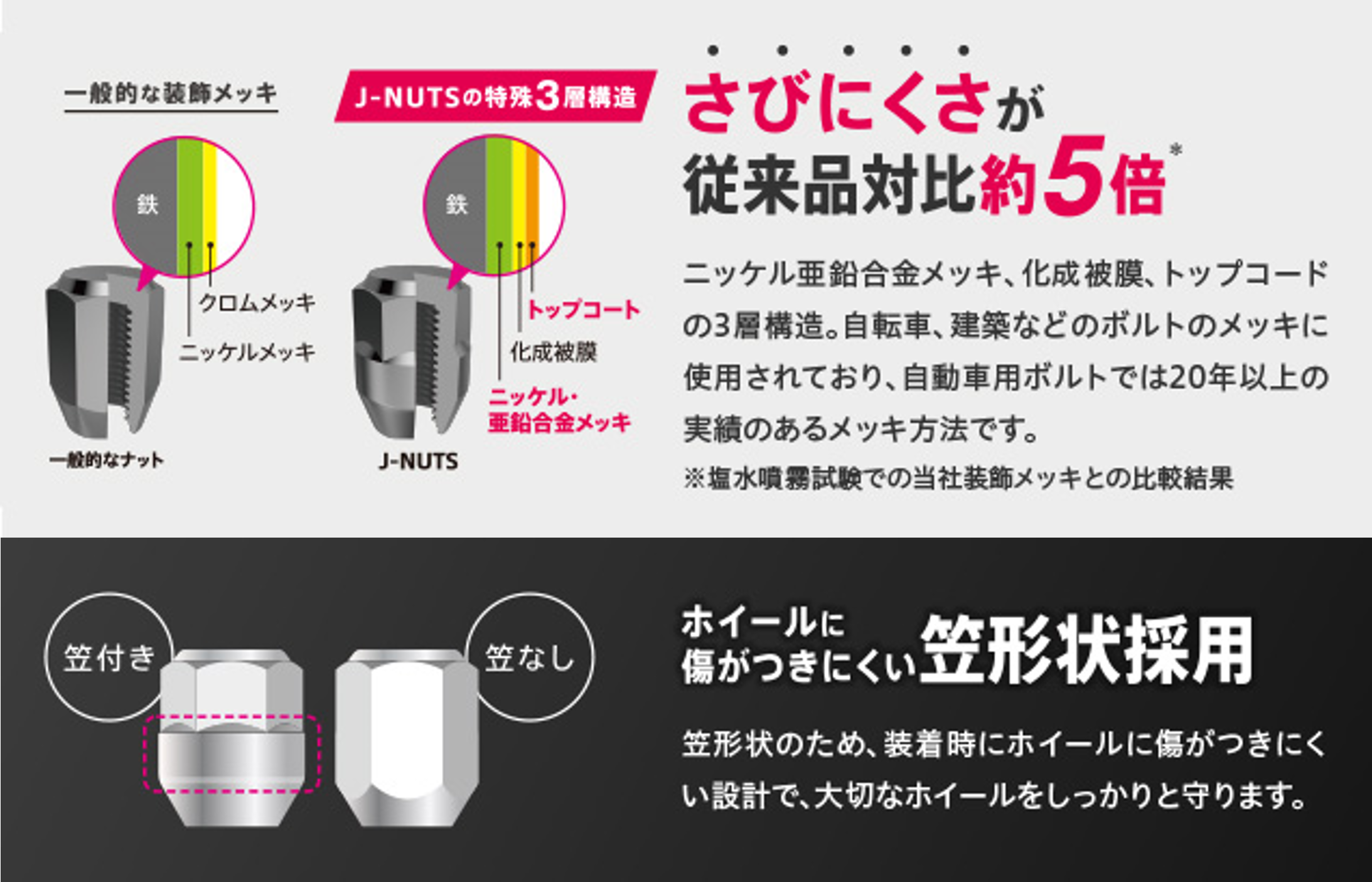 サビにくさ約5倍。 更にホイール傷が付きにくい構造、笠形状採用!!