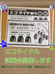 エコサイクル試乗会を開催します! 2012年6月27日 今週末エコサイクルの試乗会を開催します!エコサイクルとは、エコタイヤを体感できる特別仕様の自転車に試乗していただき、エコタイヤの性能を体感していただけます。本当にエコタイヤって違うのか?そんなものに乗ってわかるのか?と、どうなの?と思っているあなた!ぜひ、試乗会へいらしてください。期間:2012年6月29日(金)~7月1日(日)時間:10:00~19:00