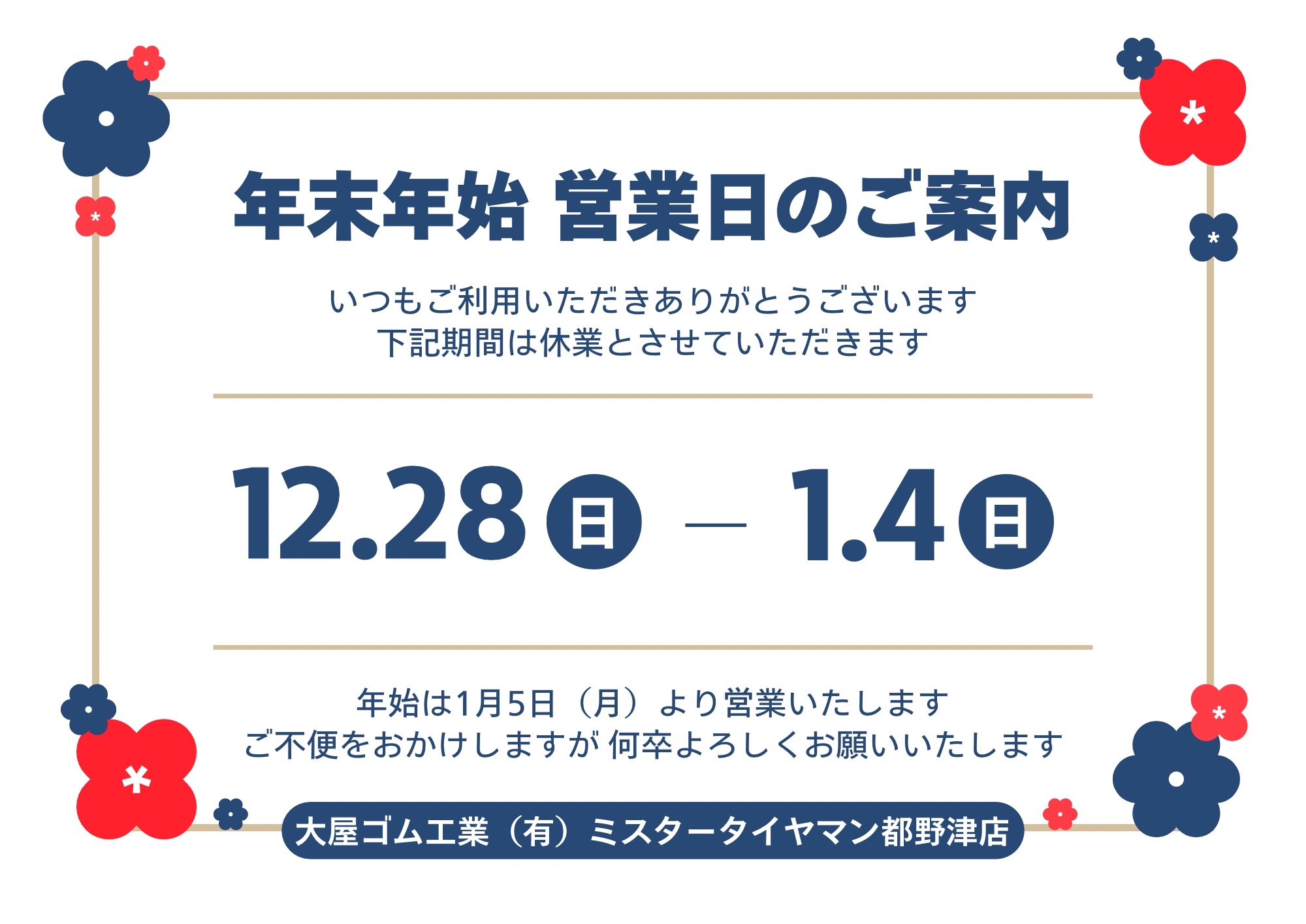 下記の期間を年末年始休業とさせて頂きます!