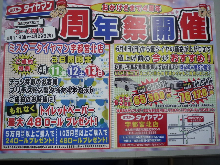 4月11日/12日/13日の3日間はチラシご持参のブリヂストンタイヤ4本セット
