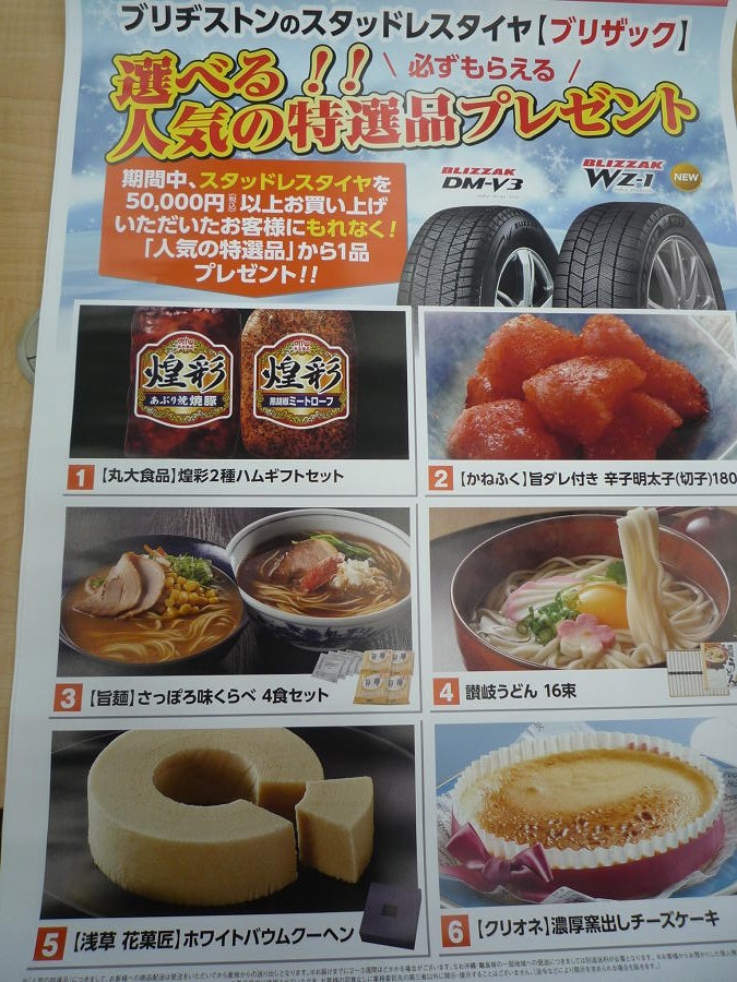 スタッドレス早期購入キャンペーン開催 2025年9月15日 9月13日から11月30日まで スタッドレス早期購入キャンペーン 開催致します ブリヂストンのブリザック4本お買い上げで 素敵な特選品グルメが必ずもらえます スタッドレスのご予約は早めのほうが しっかり、じっくり、確実に、商品選びが出来ますよ