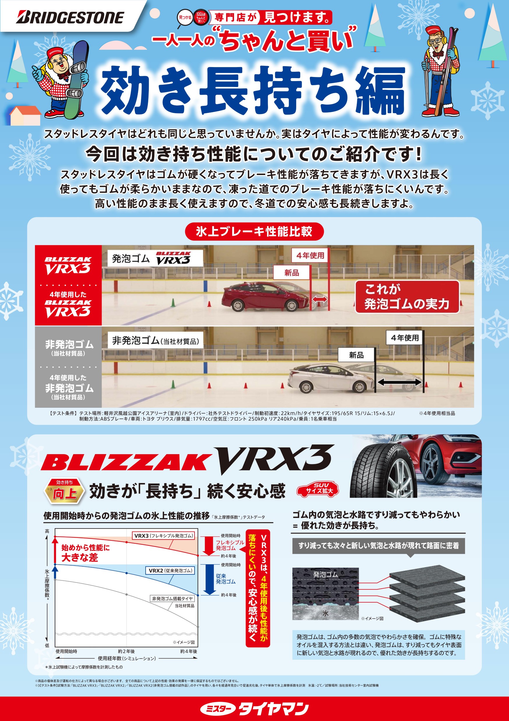 その点VRX3は、年数が経ってもゴムの柔らかさを保つので、凍った路面での安心感が違います。