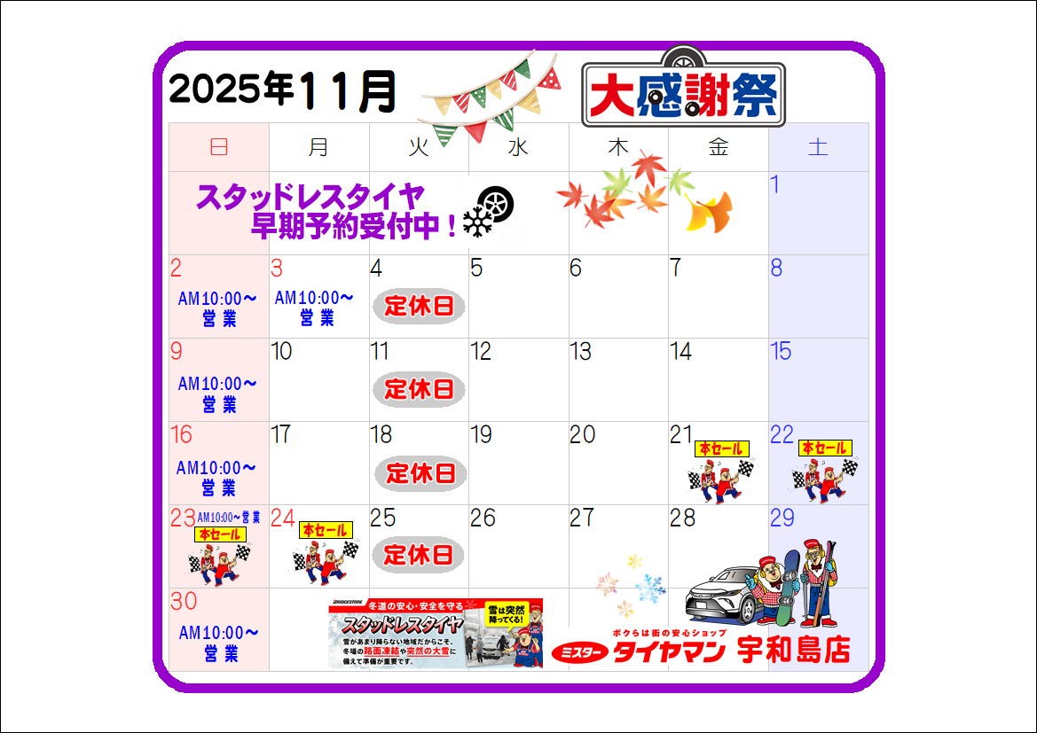 11月の営業カレンダー 2025年10月30日 ◎11月の営業カレンダーです! 11月は恒例の「冬の大感謝祭開催」実施します (^_^)v ☆お楽しみ♡特典ありの 一ヶ月間~ ♪♫♩ ☆夏タイヤも冬タイヤもお買得! ☆冬道の安心・安全を守る(スタッドレスタイヤ) 早期予約受付中! お見積無料! スタッドレスタイヤ◉続々・・・入荷しております。 皆様のご来店お待ちしております<(_ _)>