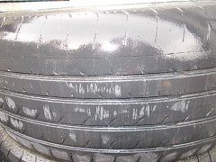 タイヤ側面、ほぼ横です。本来なら路面に接地しない場所ですが、結構摩耗してます。 原因は空気圧が低すぎた為です。タイヤがよれまくってという感じです。