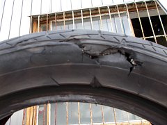 道路のキャッツアイを40キロの速度で踏んでしまってタイヤがパンクしたとの お電話を頂きお客様の所に伺うと、タイヤはボロボロの状態でした。