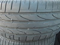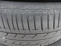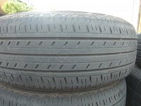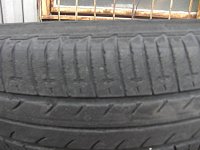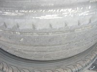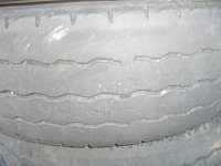 画像のタイヤは、新車から装着されて6年使用されたタイヤです。 画像上が前輪でして、やはり肩のあたりに、細かなヒビがビッシリ入ってます。