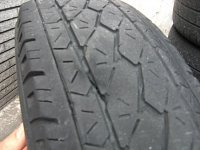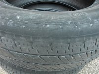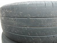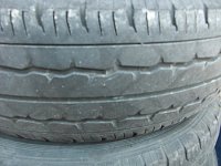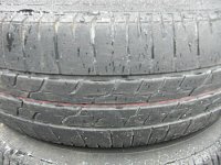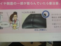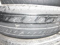 これは、分りやすいタイヤの片べりです。 タイヤ側面のタイヤメーカーのロゴまで減ってしまいそうです。