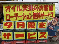 9月限定のキャンペーンで、エンジンオイル交換いただいたお客様に 無料タイヤローテーション(位置交換)を実施します。