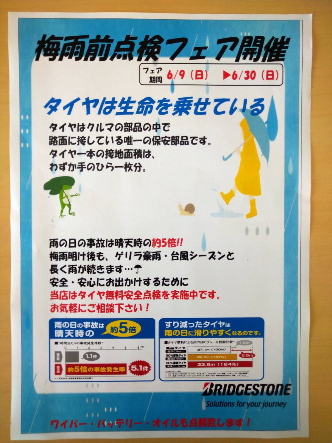 梅雨前点検フェア開催 2024年6月7日 6/9(日)から 6/30(日)まで梅雨前点検フェアを開催します。 点検内容はタイヤの溝、ヒビ、空気圧など点検致します。 すり減ったタイヤは雨の日は滑りやすくなります。 点検時間は約5分ですのでお気軽にお越しください。