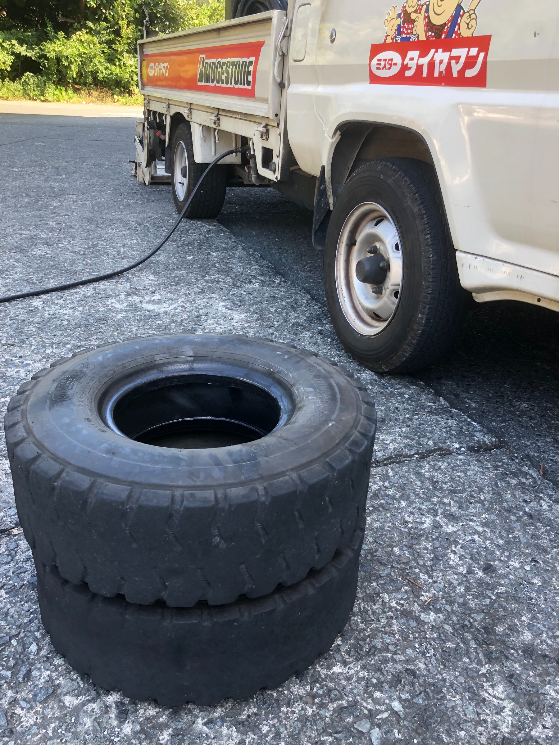 当店はフォークリフトのタイヤも取り扱っています。こちらはお客様の会社にお伺いしての作業になります。