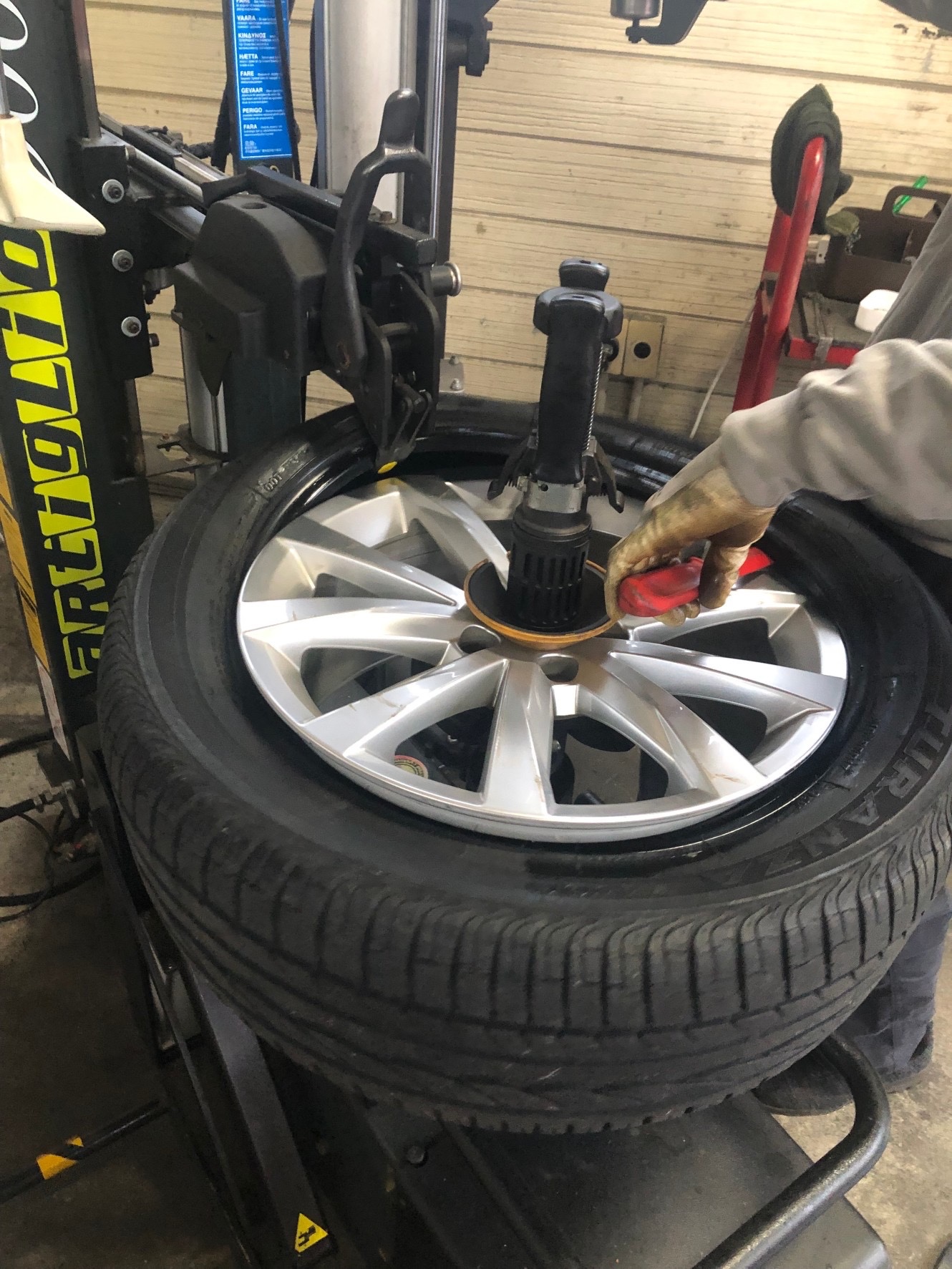 年数が経過してるのでだいぶタイヤが硬いですが、当店はレバーレスタイヤチェンジャーを導入してるのでサクサク交換していきます。