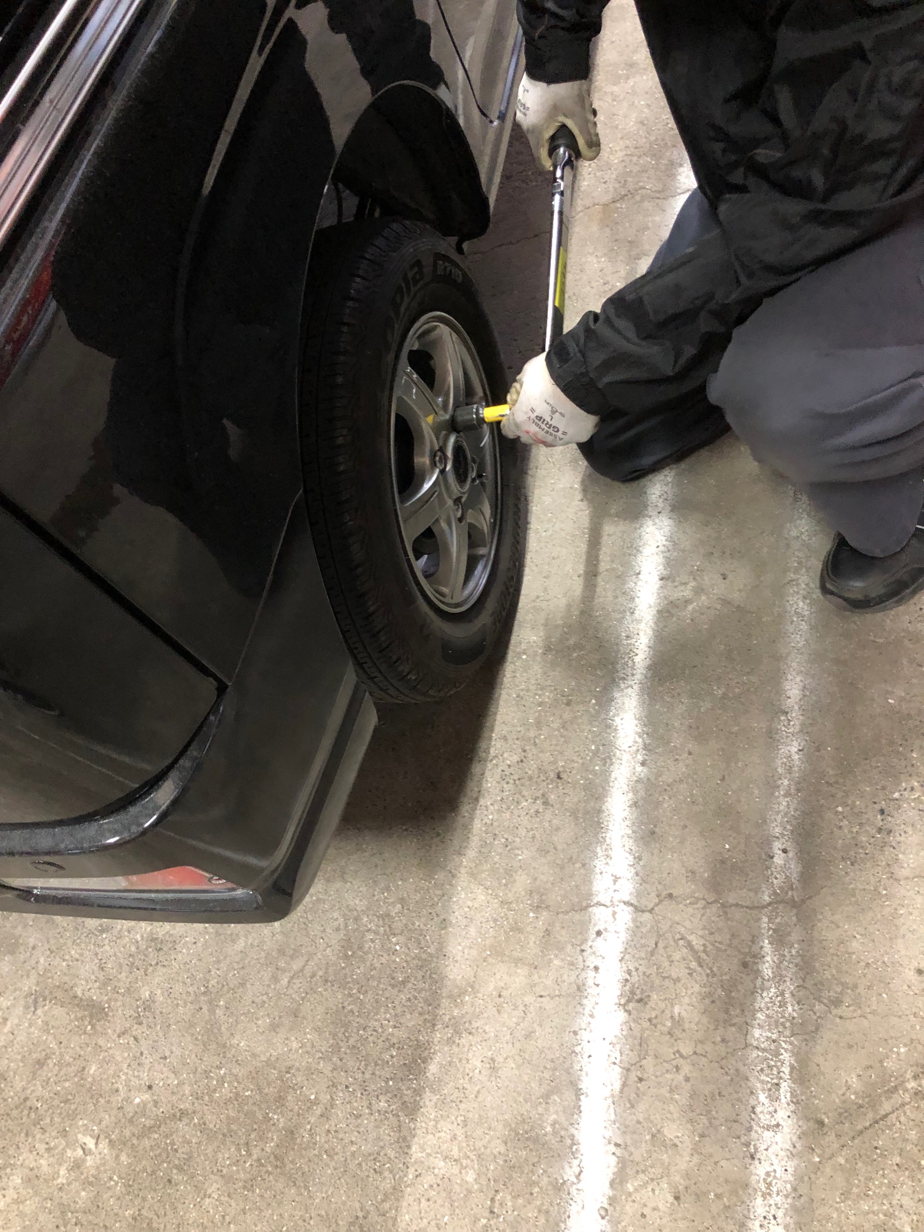 トルクレンチを使用し、万一緩みがあった場合は規定のトルクで増し締めを実施します。同時に空気圧の点検も致します。