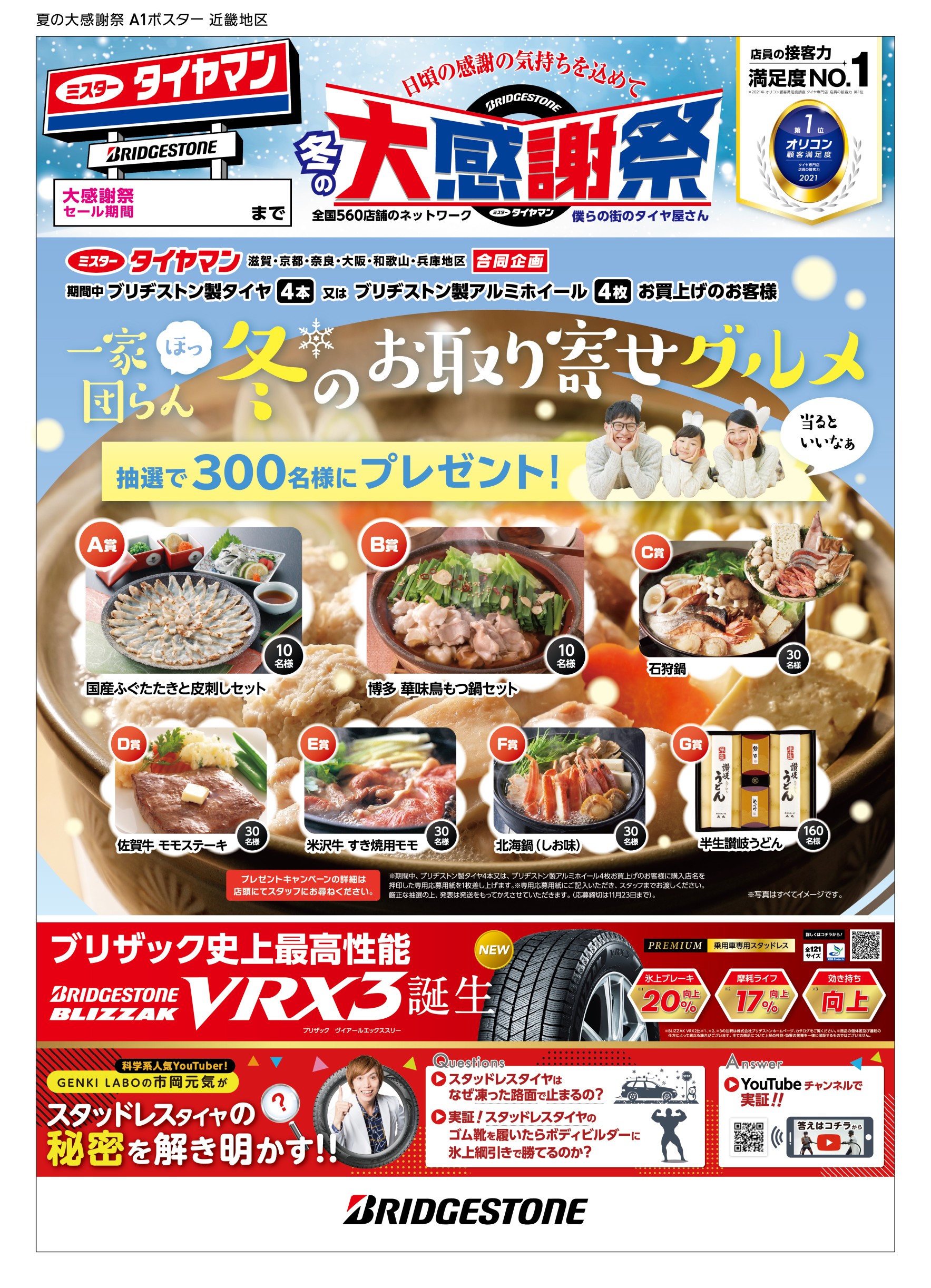 近畿のミスタータイヤマン全店で抽選300名様にプレゼント。