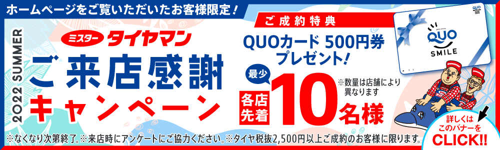 ミスタータイヤマンご来店感謝キャンペーン!! 2022年6月29日 ステップ1 ご来店時に「ホームページを見た」とお伝えください。 ステップ2 タイヤを購入(2.500円以上) ステップ3 その場でアンケートにご回答ください。